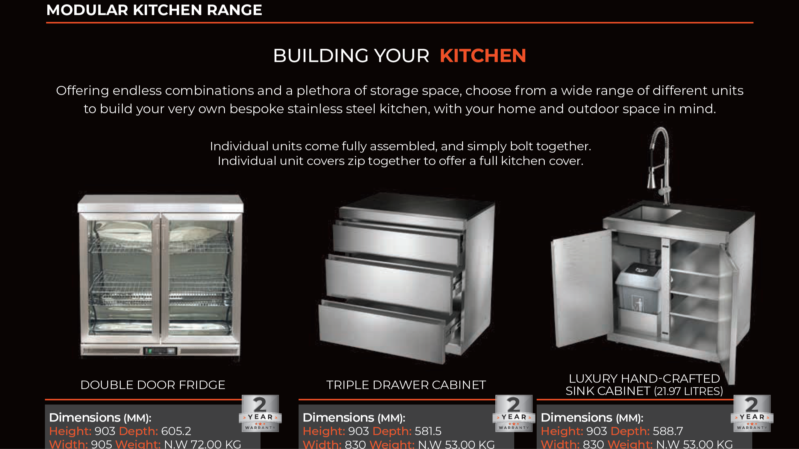 Take alfresco dining to the next level with the total grilling package. Design your kitchen exactly how you’d like it. With a broad range of stainless steel modular units available, from BBQ’s, sinks, fridges, drawers and doors to gas storage units, the combination possibilities are simply endless! This range boasts luxury outdoor living at an affordable price.