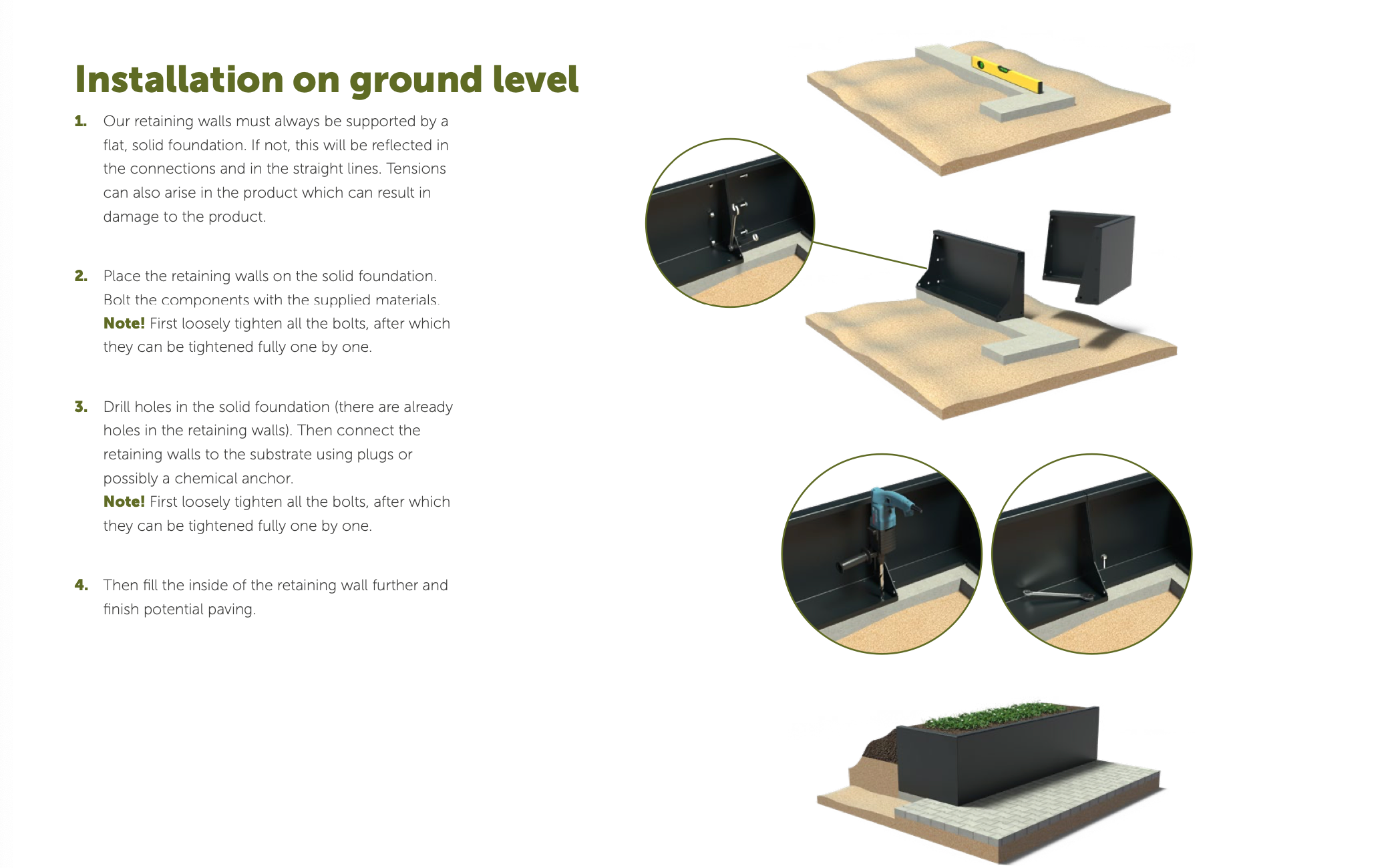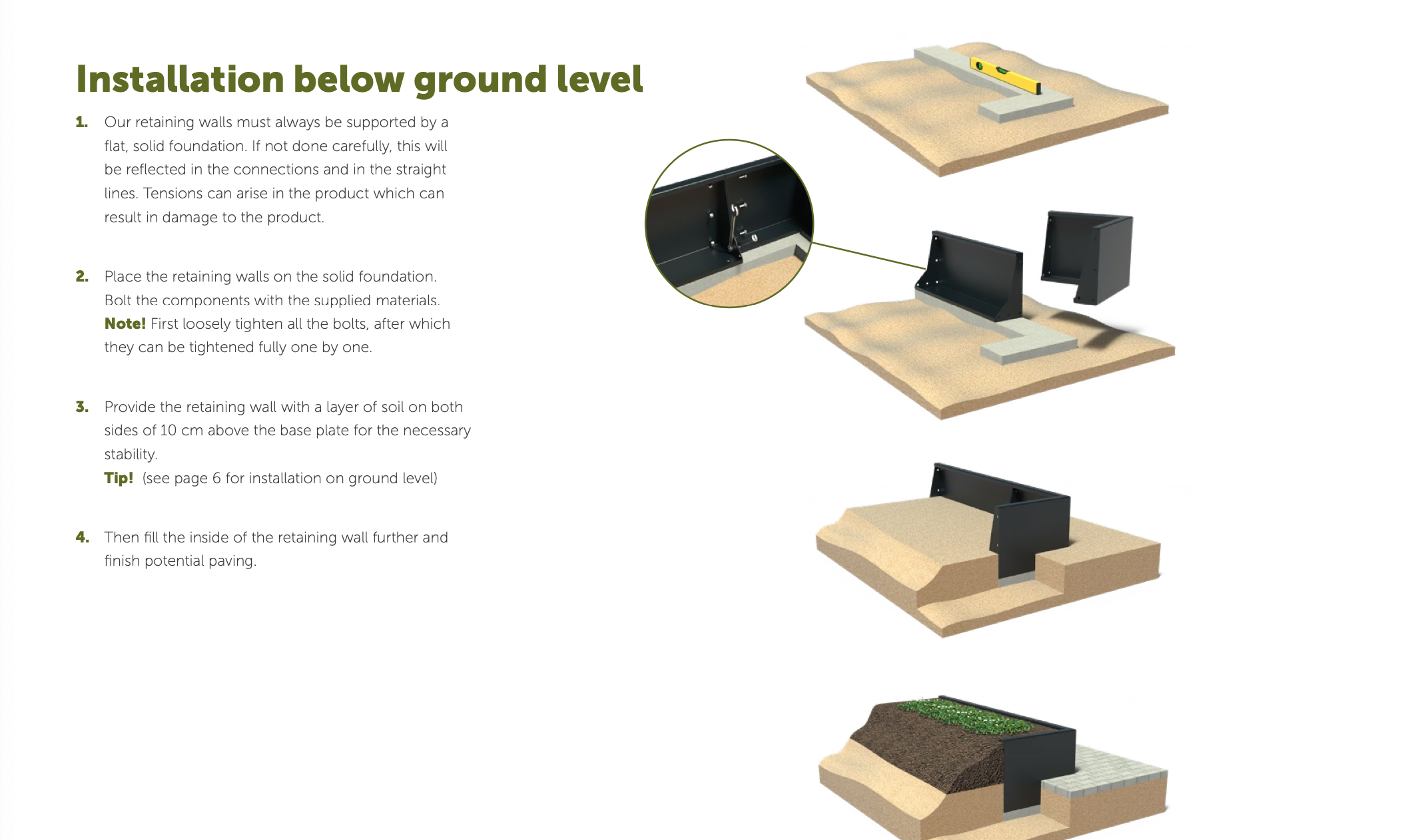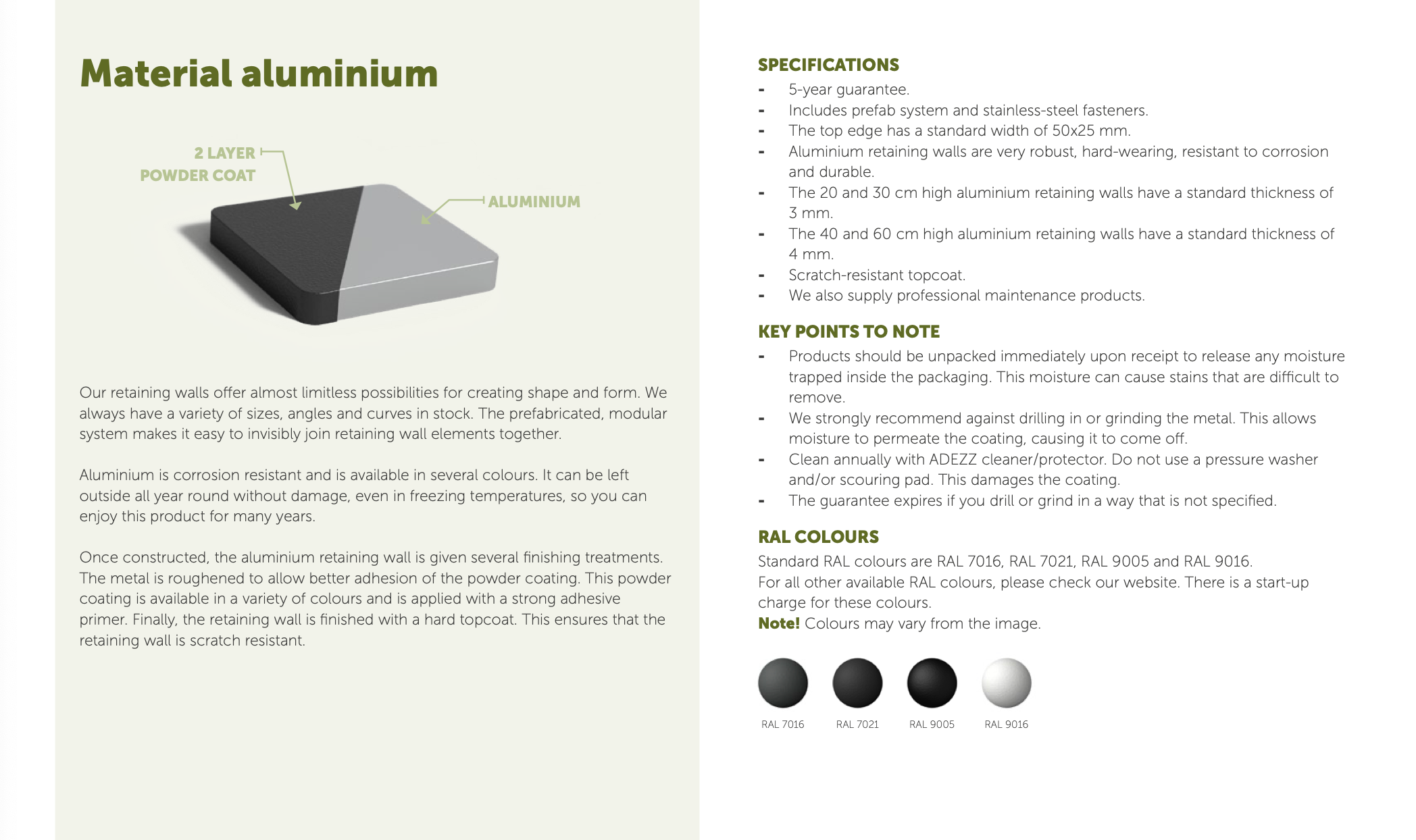 - The 40 and 60 cm high aluminium retaining walls have a standard thickness of 3 mm.