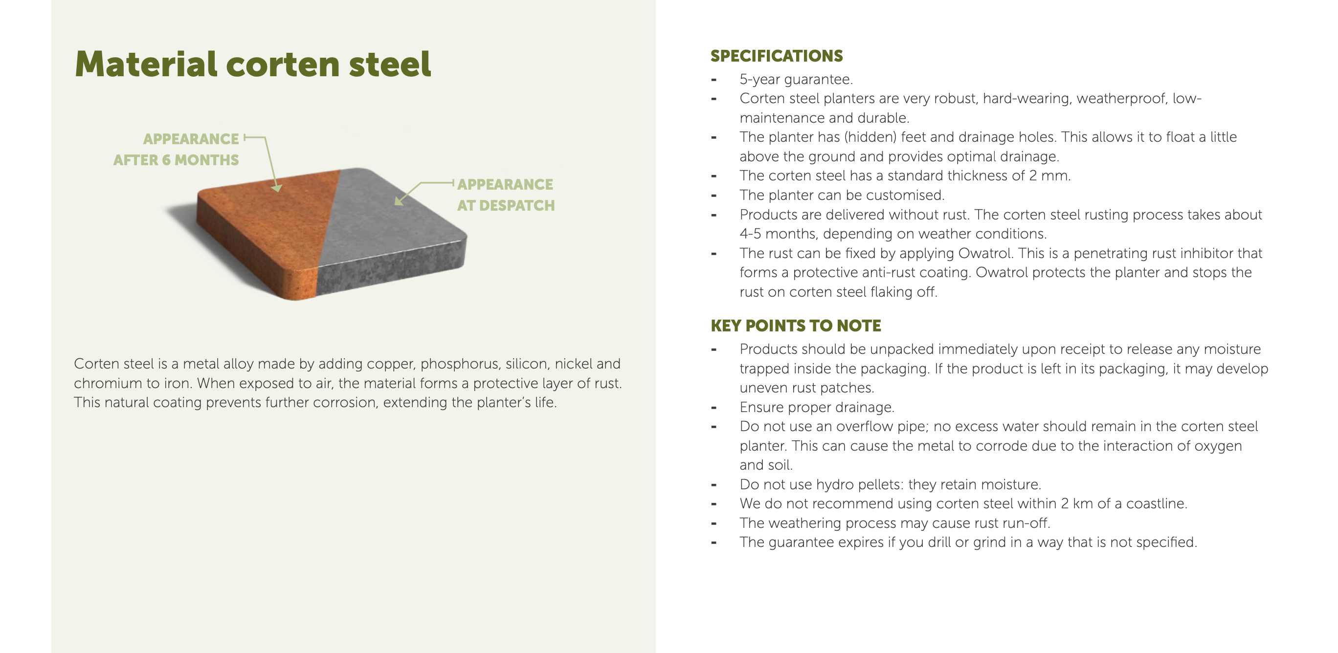 - Do not use an overflow pipe; no excess water should remain in the corten steel planter. This can cause the metal to corrode due to the interaction of oxygen and soil.