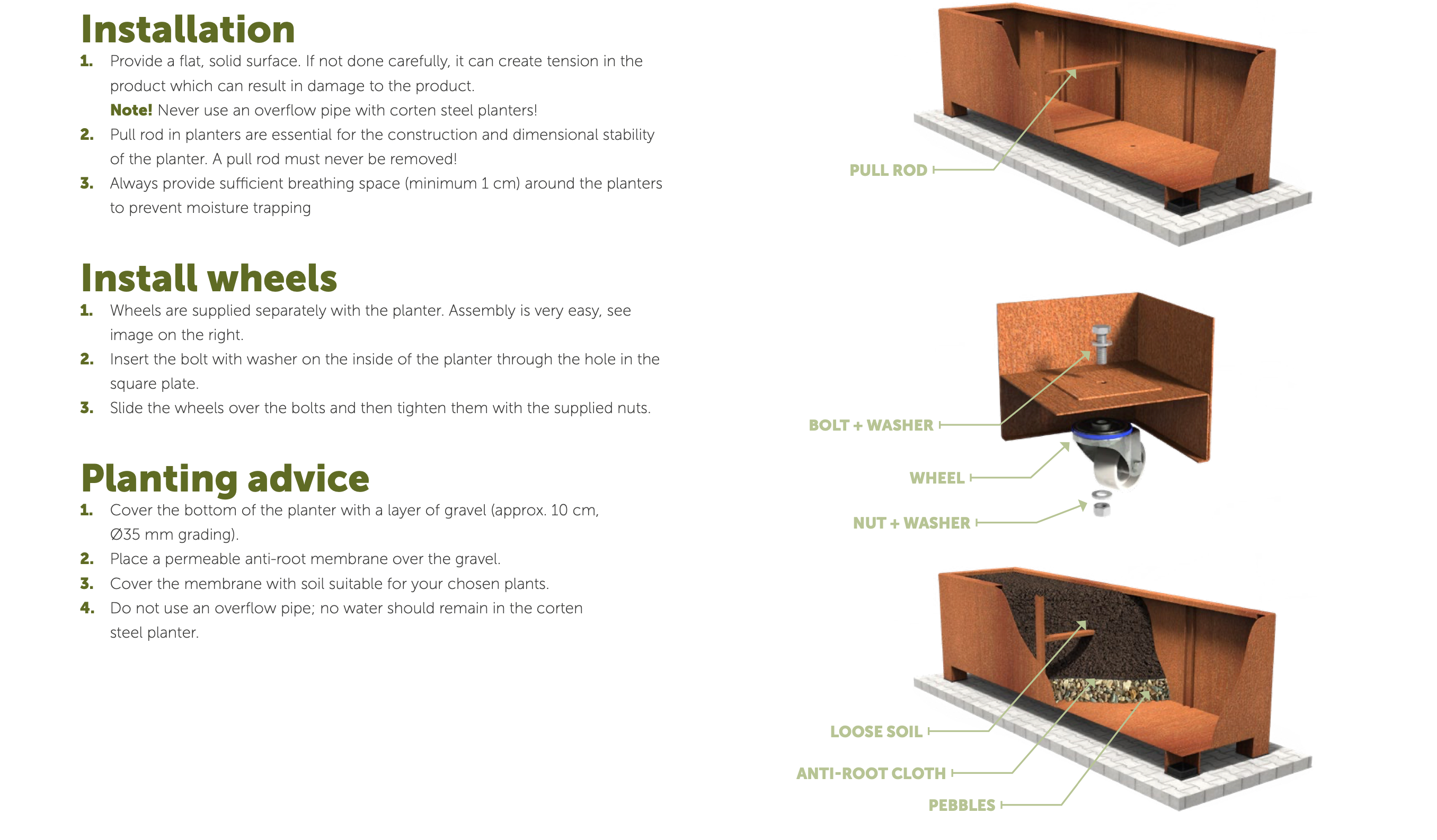 - Do not use an overflow pipe; no water should remain in the corten steel planter.