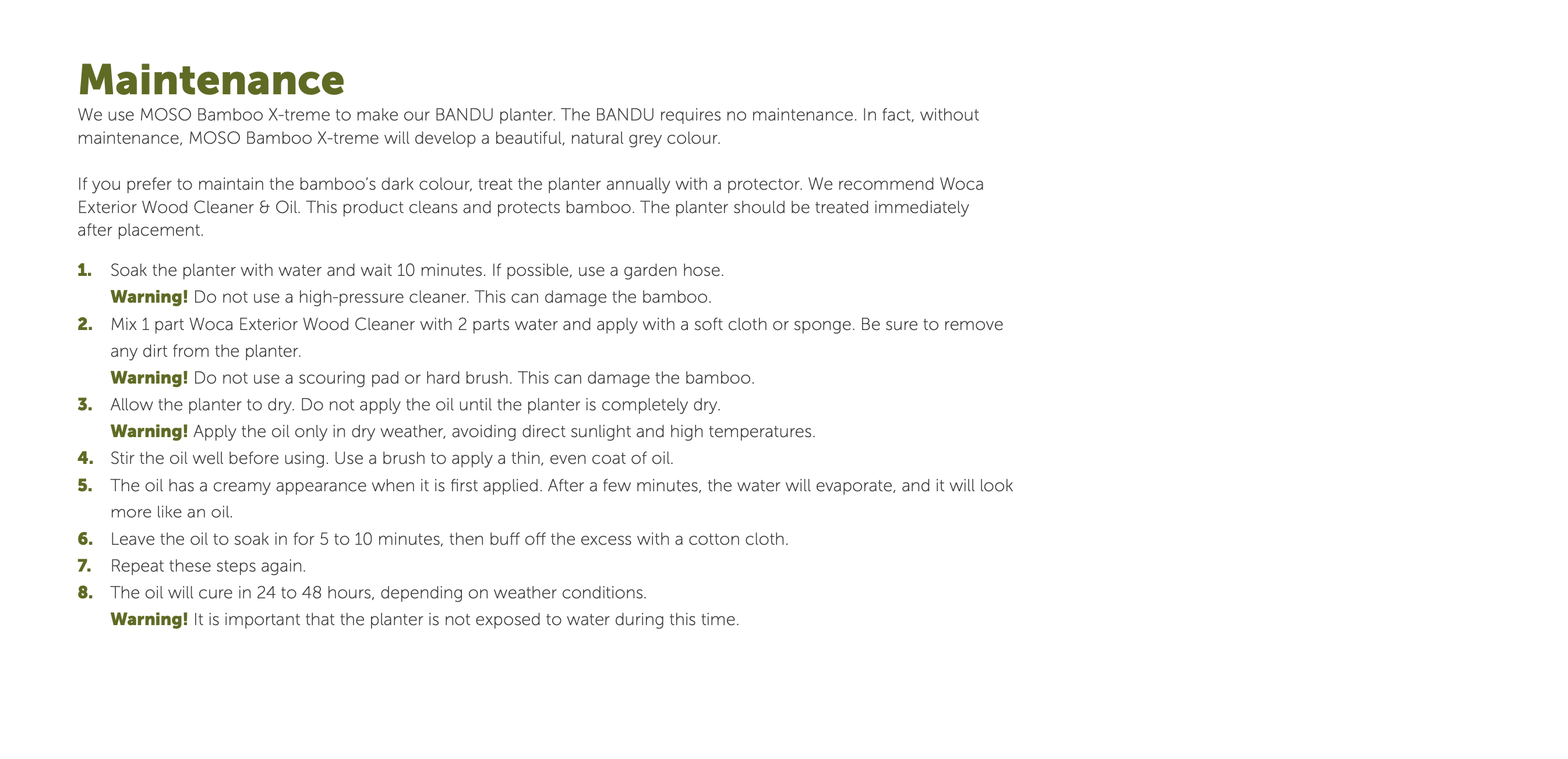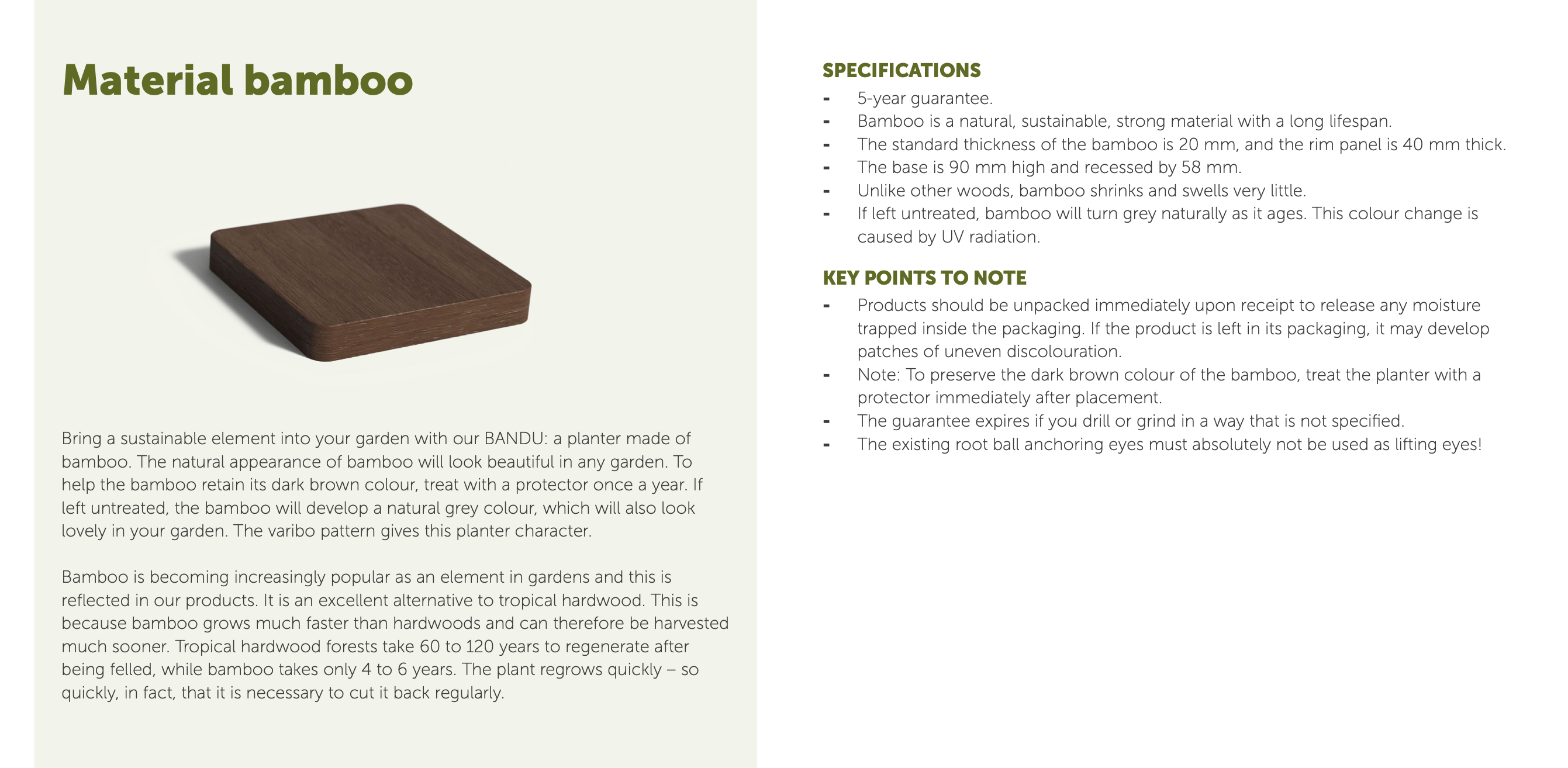 - Note: To preserve the dark brown colour of the bamboo, treat the planter with a protector immediately after placement.