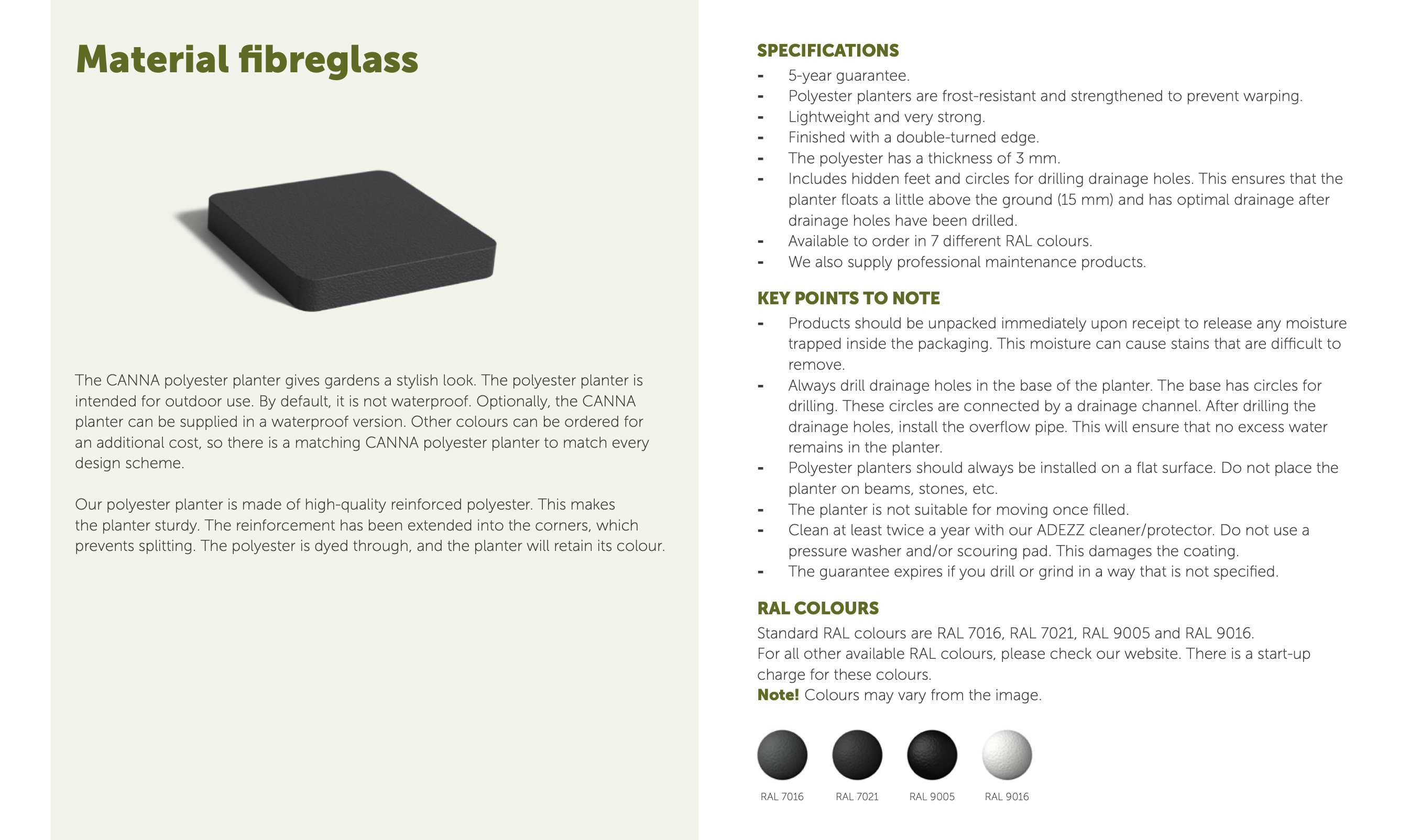 Our fibreglass planters are made of high-quality reinforced fibreglass. This makes the planter sturdy. The reinforcement has been extended into the corners, which prevents splitting. The fibreglass is dyed through, and the planter will retain its colour.