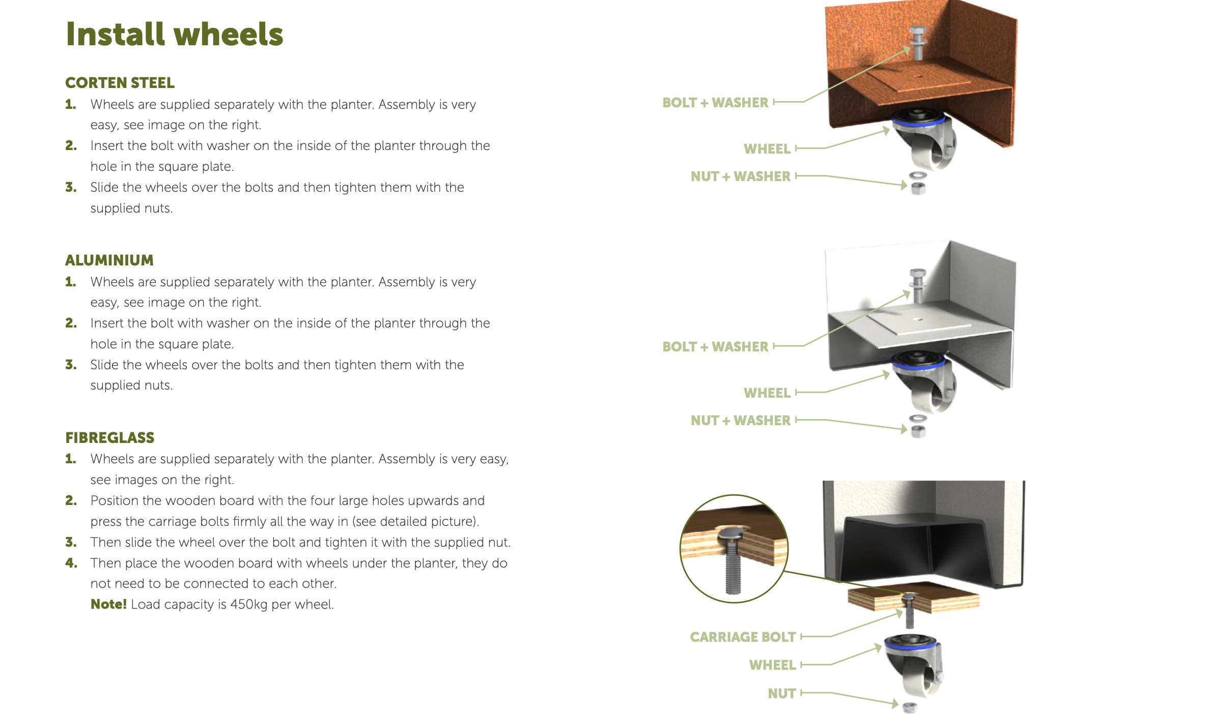 - The wheels make this planter easy to move. Note! Load capacity is 450kg per wheel.