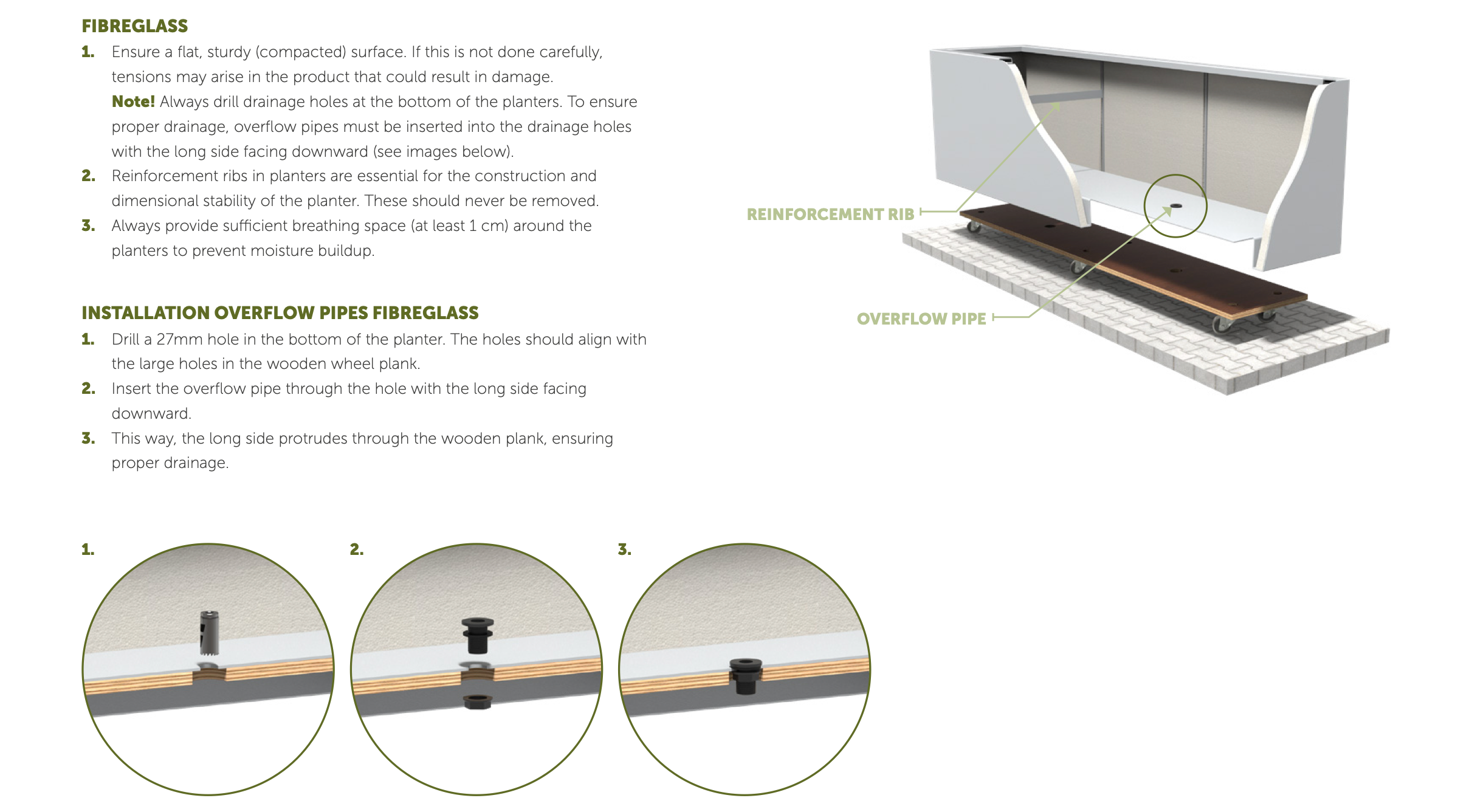 - Fibreglass planters should always be installed on a flat surface. Do not place the planter on beams, stones, etc.