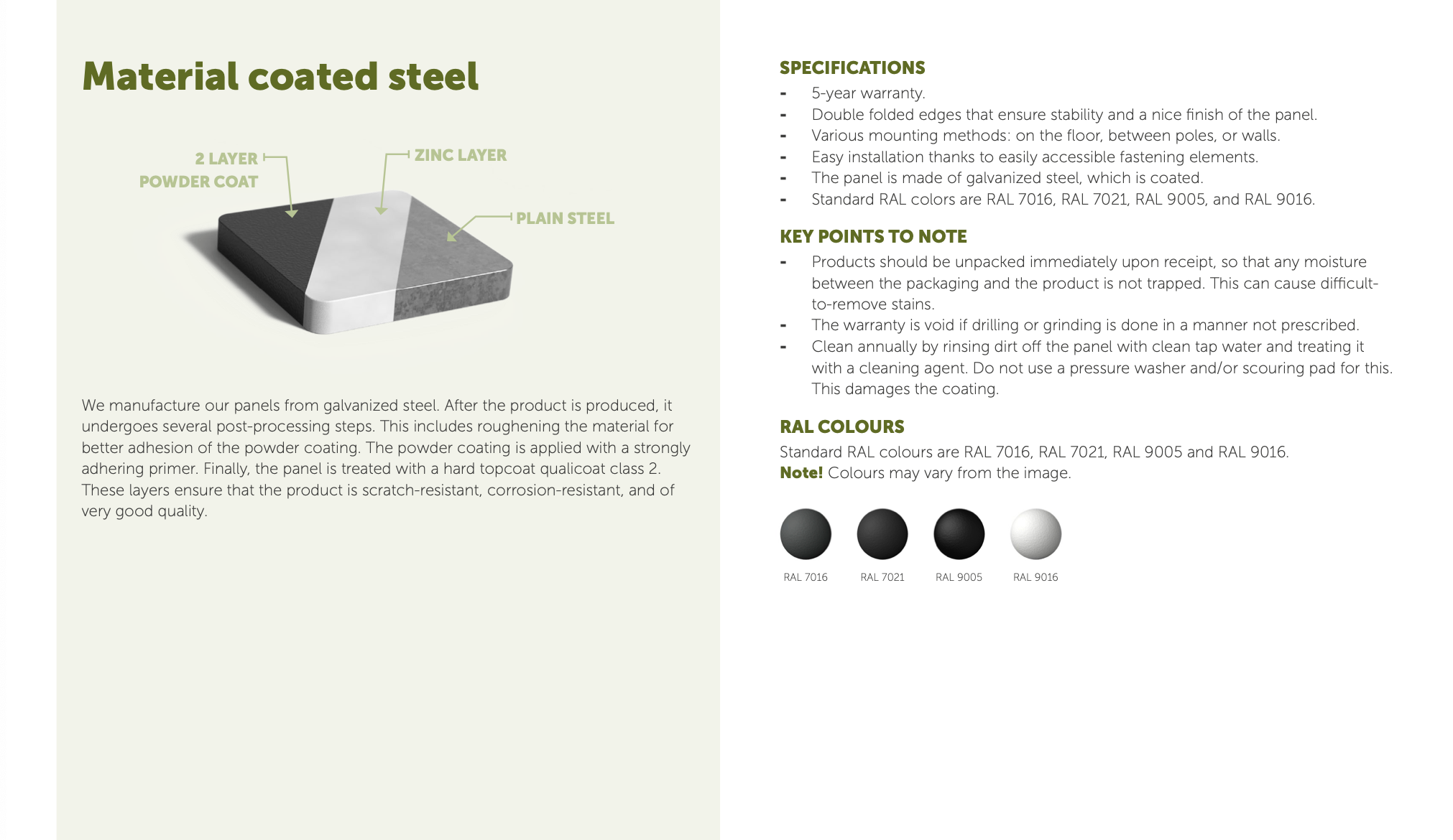 Our panels are made from galvanized steel. After the product is produced, it undergoes several post-processing steps. This includes roughening the material for better adhesion of the powder coating. The powder coating is applied with a strongly adhering primer. Finally, the panel is treated with a hard topcoat qualicoat class 2. These layers ensure that the product is scratch-resistant, corrosion-resistant, and of very good quality.