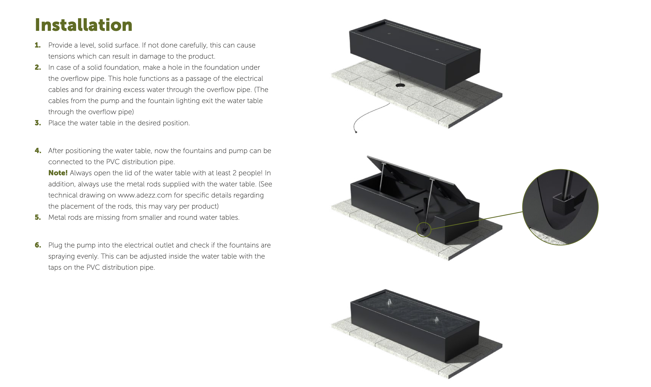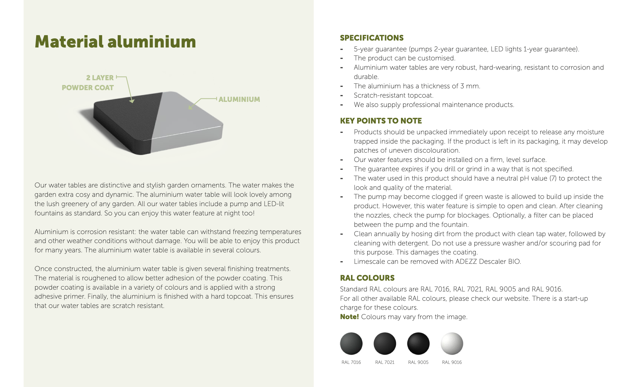 The BAYOU made of coated steel fits into any garden due to its modern design. This water feature is corrosion-resistant. Additionally, coated steel is durable and strong.