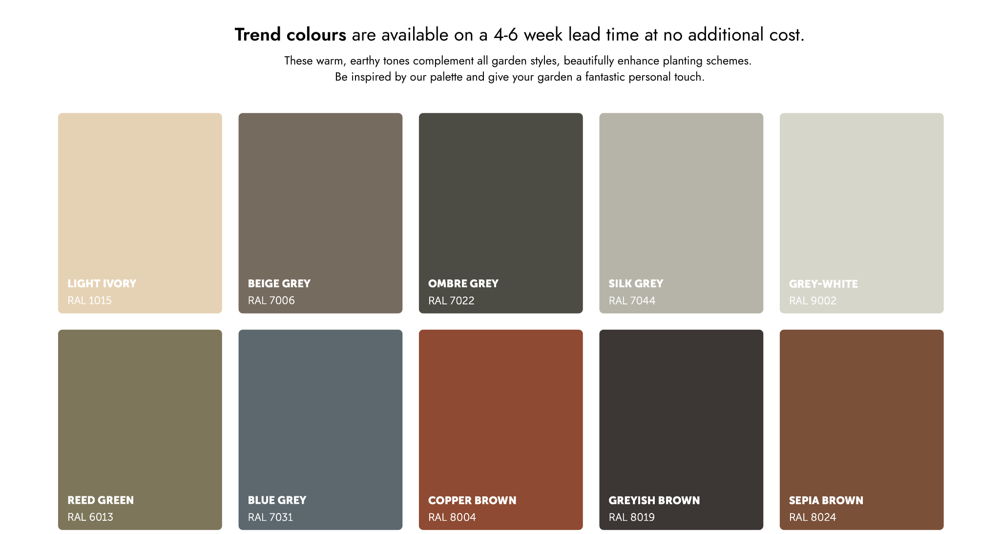 TREND colours are available with a 4-6 week lead time with no additional cost.