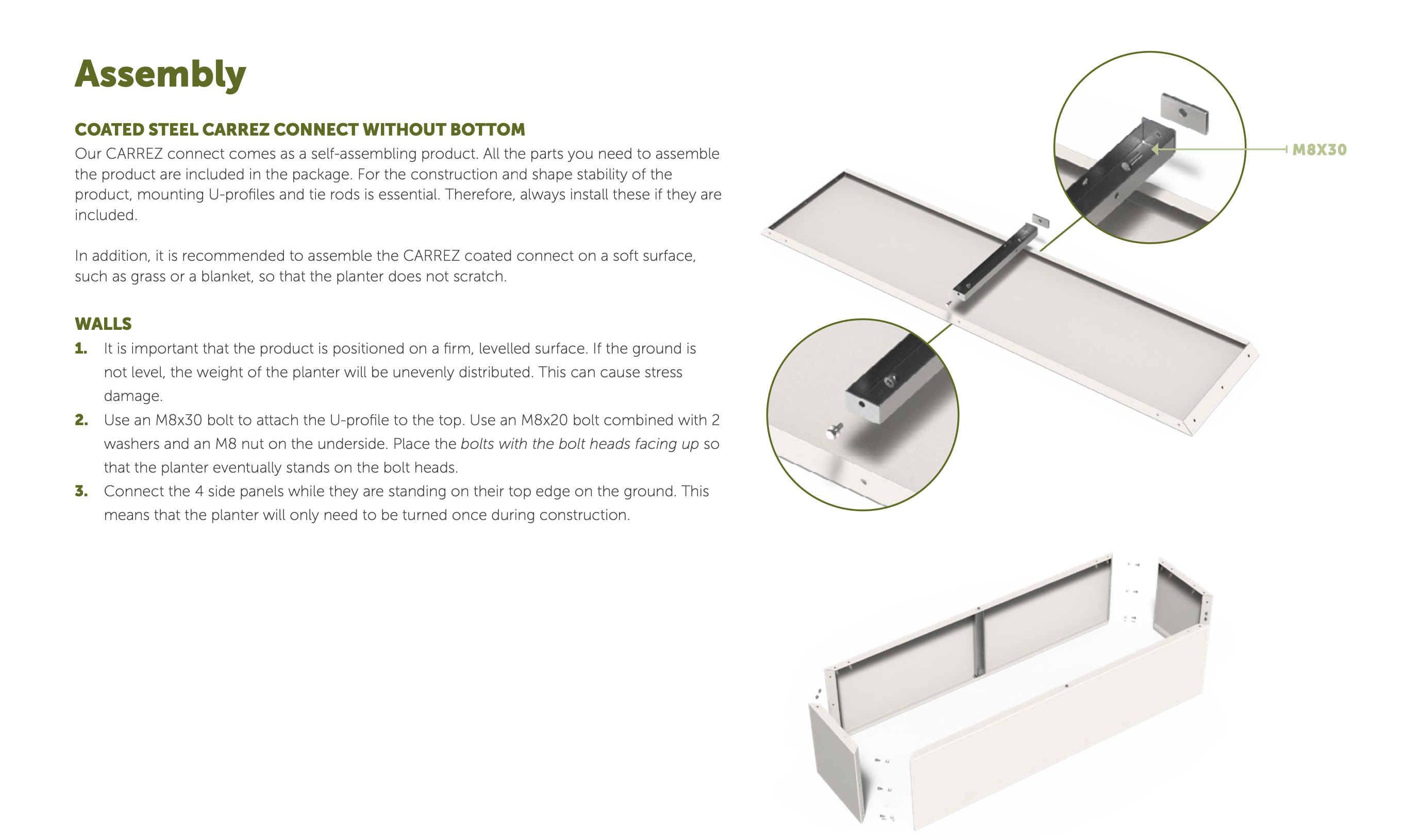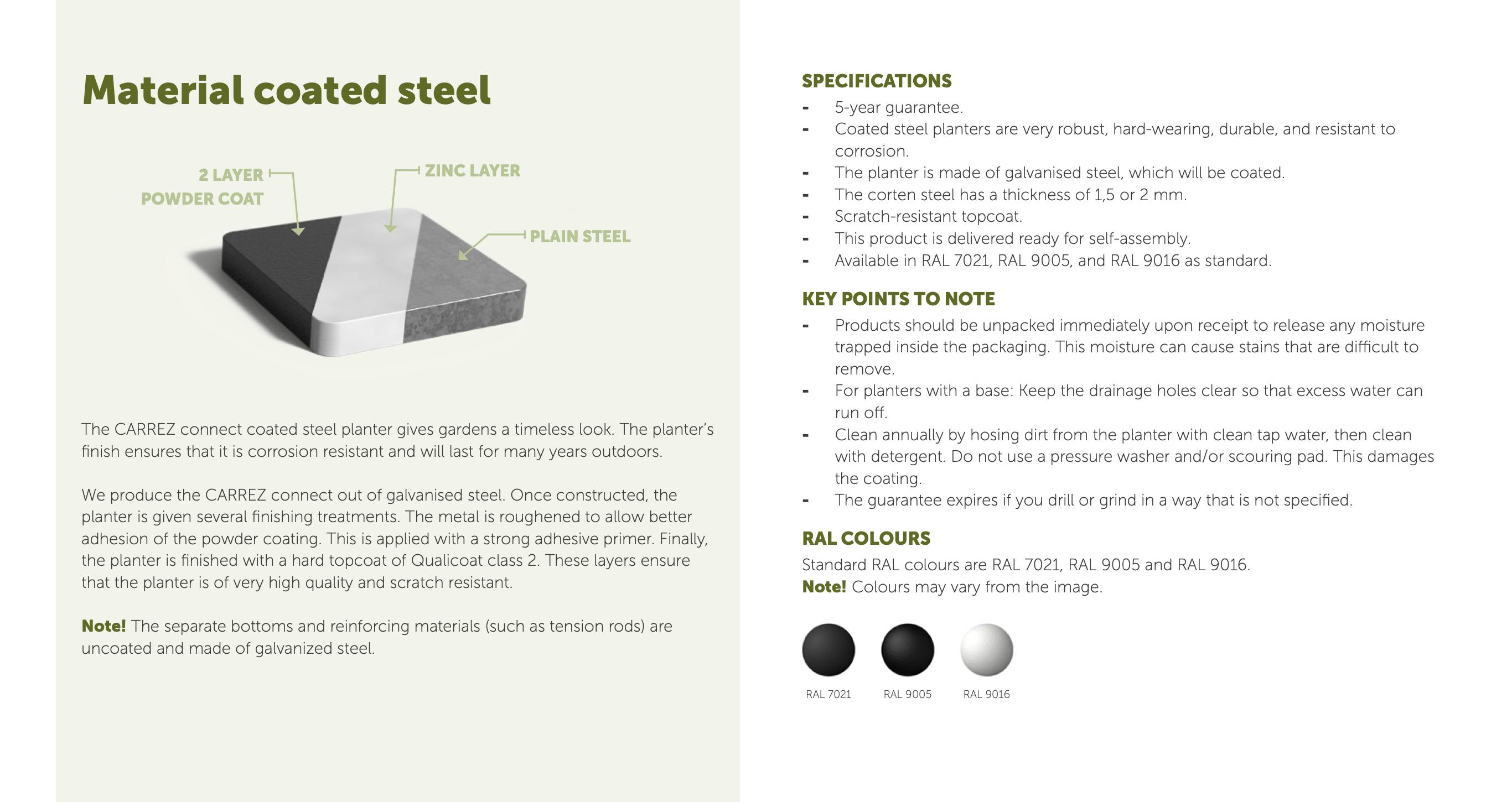 The CARREZ CONNECT is constructed from coated galvanised steel. Once constructed, the planter is given several finishing treatments. The metal is roughened to allow better adhesion of the powder coating. This is applied with a strong adhesive primer. Finally, the planter is finished with a hard topcoat of Qualicoat class 2. These layers ensure that the planter is of very high quality and scratch resistant.