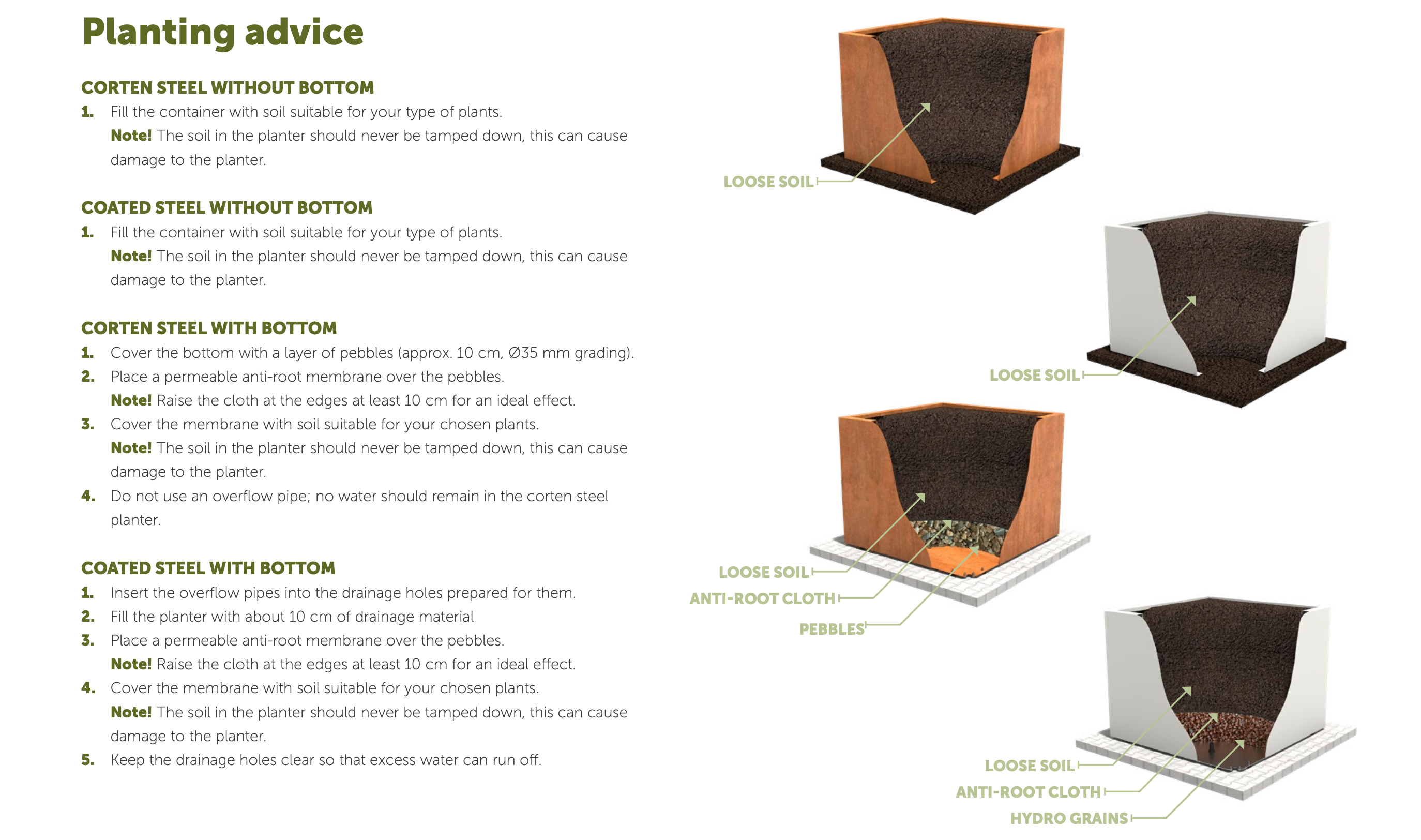 - Fill the bottom of the planter with a layer of gravel (Ø35 mm grading, approx. 10 cm).