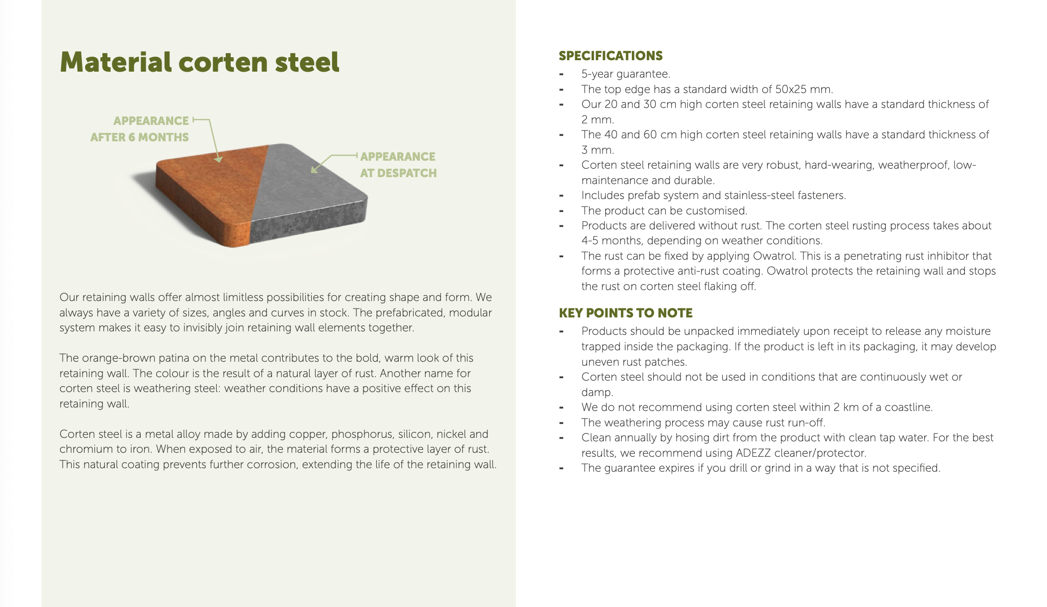 - The 40 and 60 cm high corten steel retaining walls have a standard thickness of 3 mm.