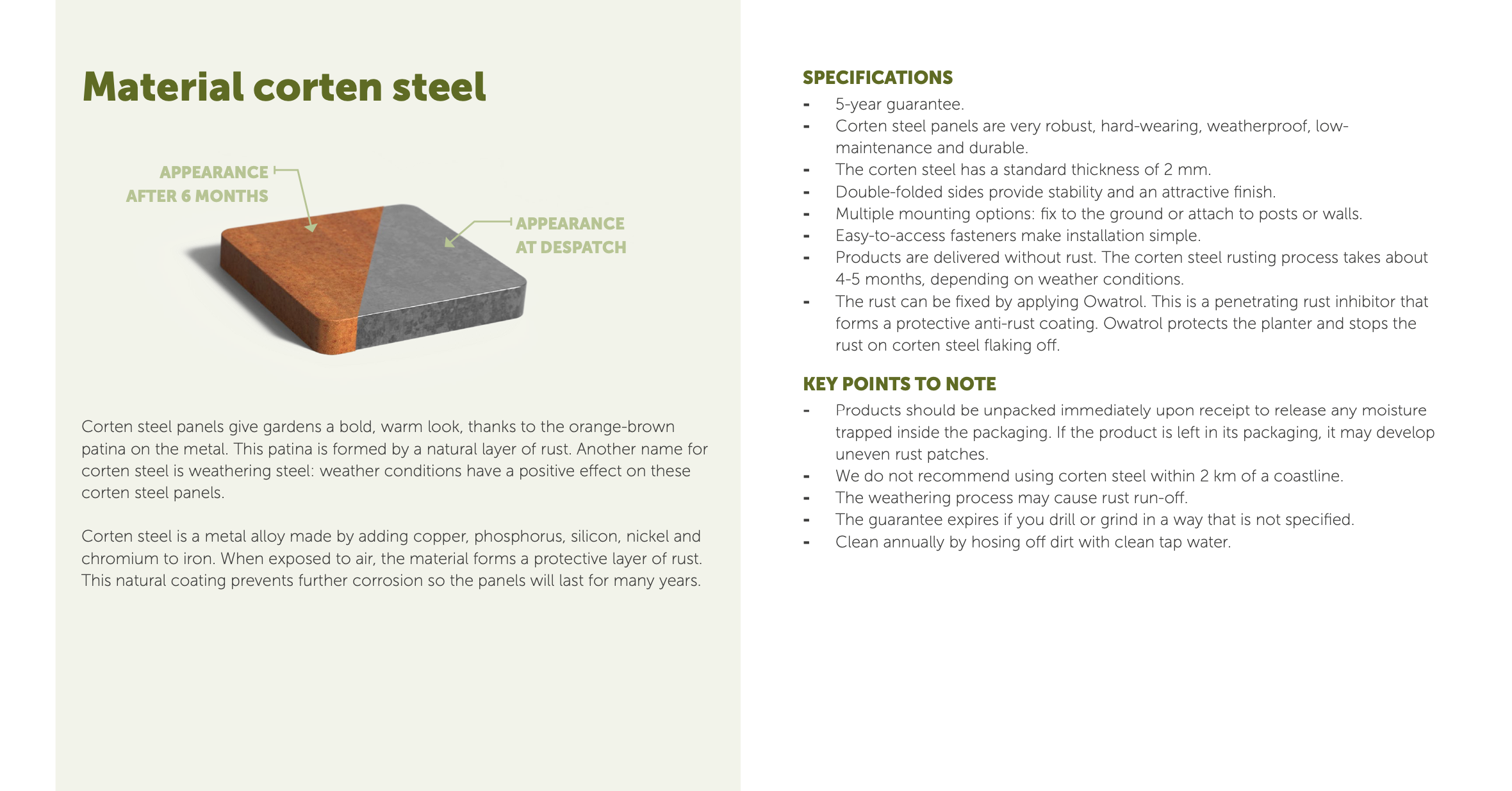 - Corten steel panels are very robust, hard-wearing, weatherproof, low-maintenance and durable.