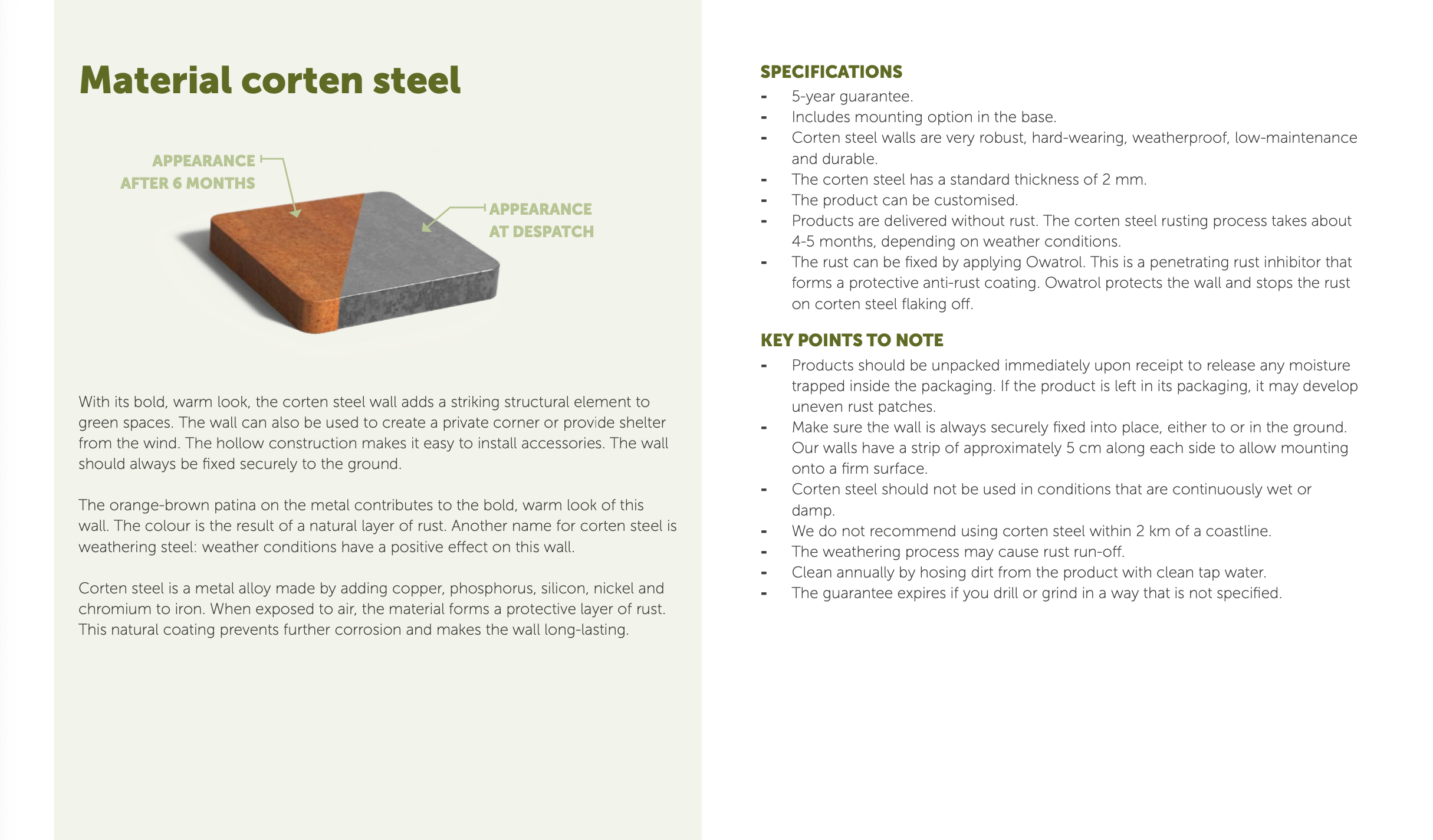 - Corten steel should not be used in conditions that are continuously wet or damp.