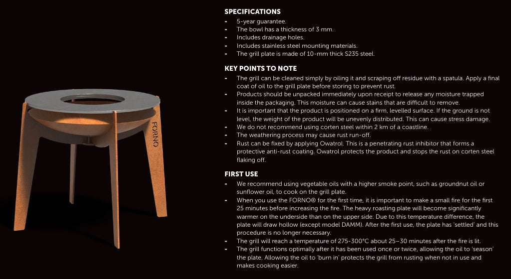 The COSA is a versatile product. From cooking to cosy fires, the COSA can do it all. This product will suit you perfectly if you love spending time outdoors. Its beautiful design and the warm colour of the corten steel help to create a warm and pleasant atmosphere. Discover a whole new world of possibilities for outdoor cooking with the COSA. Simple and stylish!