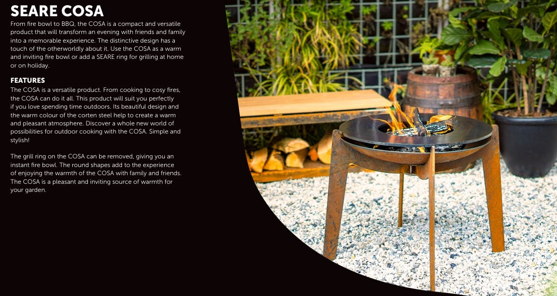 From fire bowl to BBQ, the COSA is a compact and versatile product that will transform an evening with friends and family into a memorable experience. The distinctive design has a touch of the otherworldly about it. Use the COSA as a warm and inviting fire bowl or add a SEARE ring for grilling at home or on holiday.