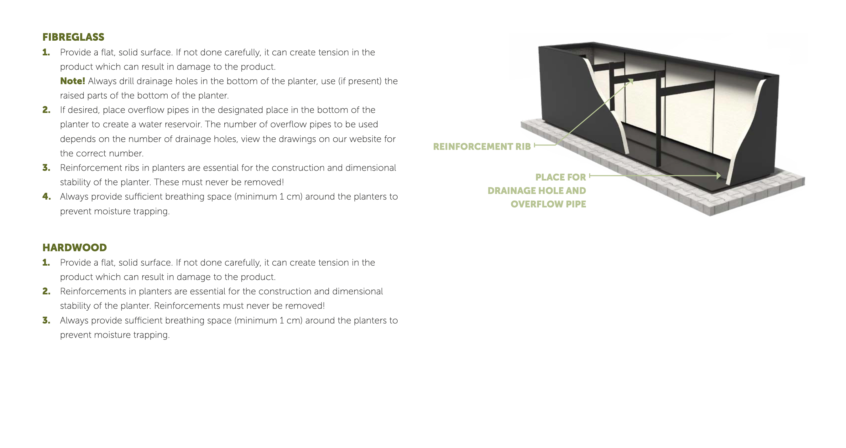 - Fibreglass planters should always be installed on a flat surface. Do not place the planter on beams, stones, etc.