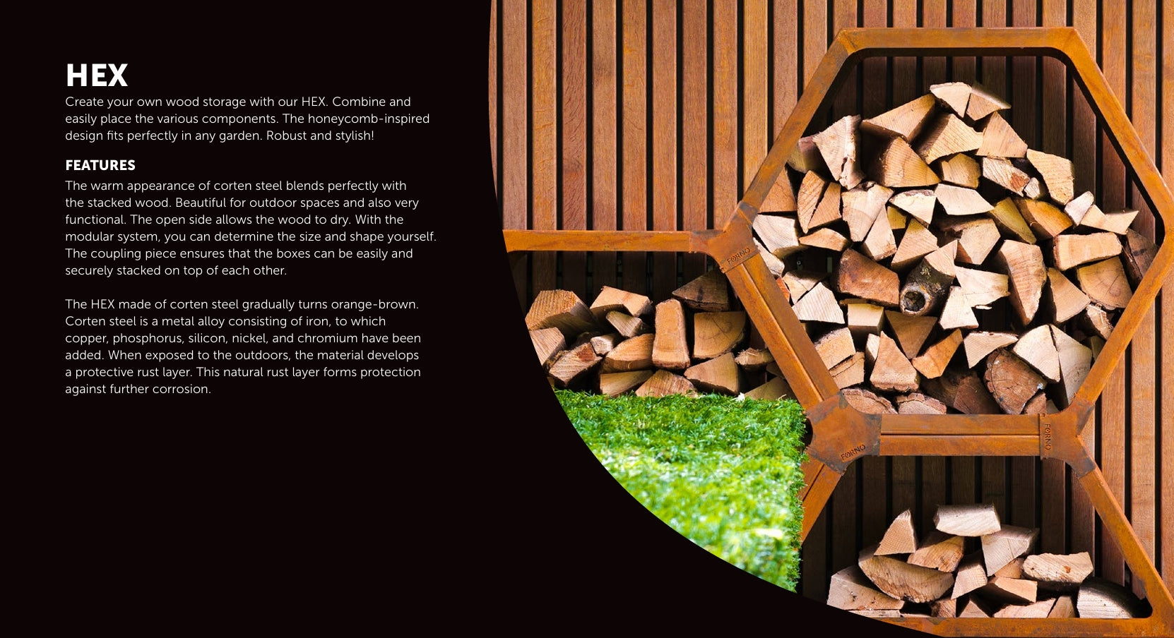 Build your perfect garden log storage solution with our HEX units. Easily combine components for a seamless fit.