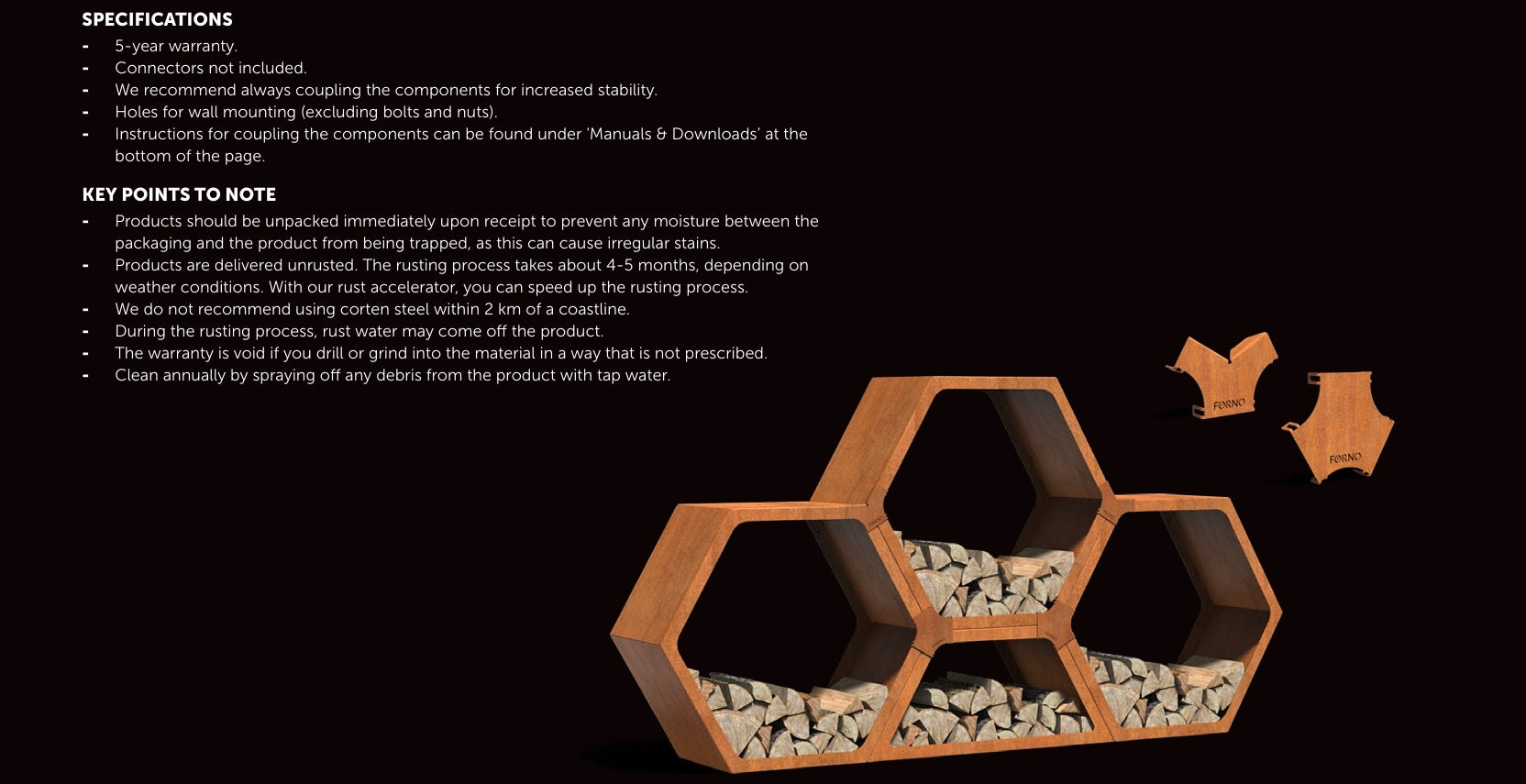 FORNO's wood storage solutions not only keep your firewood organised but also enhance the look of your outdoor space. Proper wood storage protects firewood from weather conditions such as rain, snow, moisture and heat. Proper wood storage reduces the risk of mould and rot meaning your firewood lasts longer and stays dry. The timeless and stylish designs of FORNO wood stores offer endless possibilities to make your wood storage part of your outdoor or indoor space.