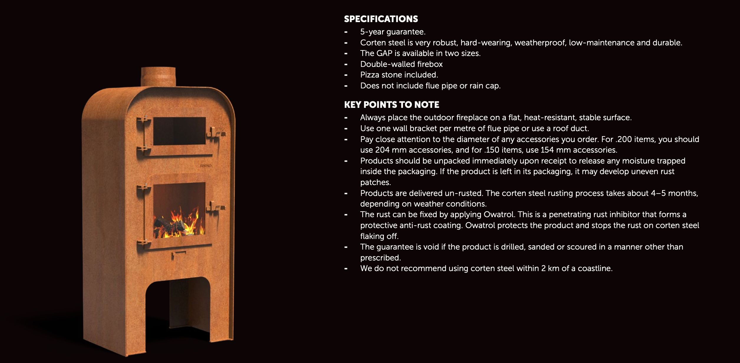 The GAP is an outdoor fireplace and pizza oven in one, making it a truly versatile addition to your garden. An outdoor fireplace and a pizza oven, all in one. Because of its compact design, the GAP is suitable for any garden – no matter how small your outdoor space, you too can create the tastiest pizzas al fresco! The warm colour of corten steel combines beautifully with other natural garden elements. It will also look wonderful when paired with other corten steel products, such as one of our corten steel wood storage.