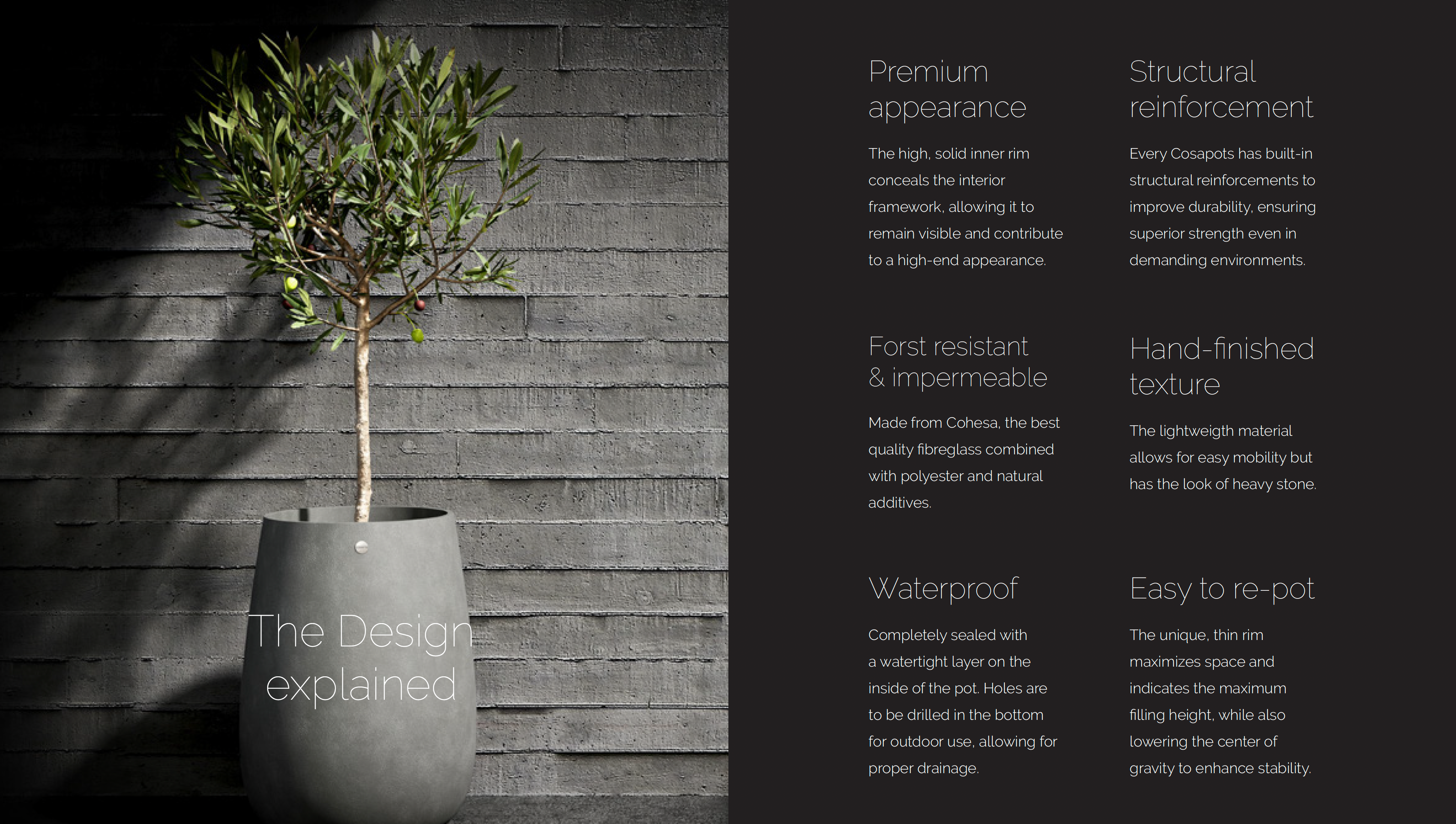 Cosapots planters exemplify premium craftsmanship and architectural precision, designed in collaboration with Belgian architects and meticulously handcrafted by expert artisans.