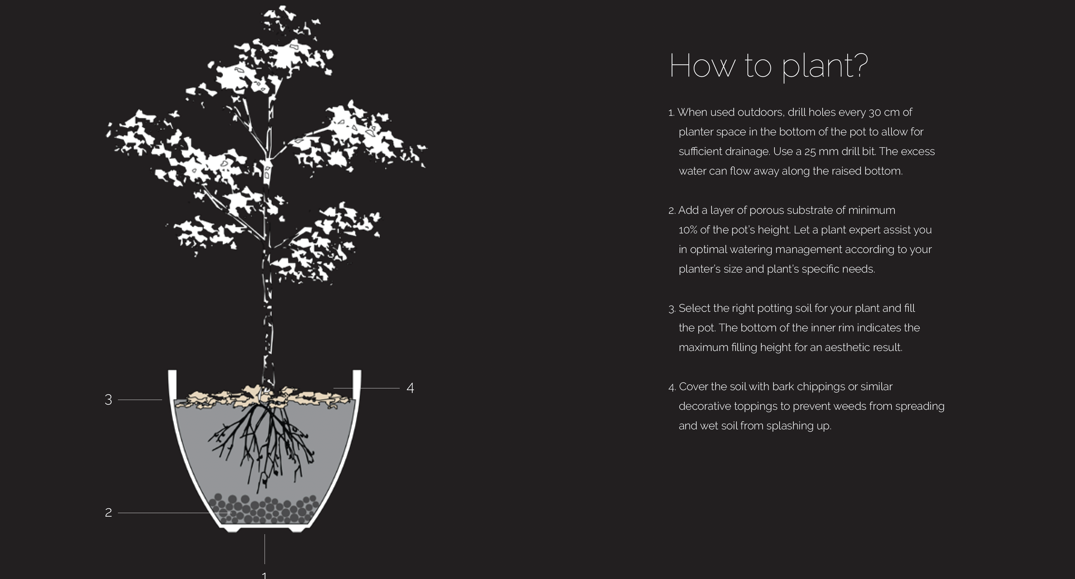 - Add a layer of porous substrate of minimum 10% of the pot’s height. Let a plant expert assist you in optimal watering management according to your planter’s size and plant’s specific needs.
