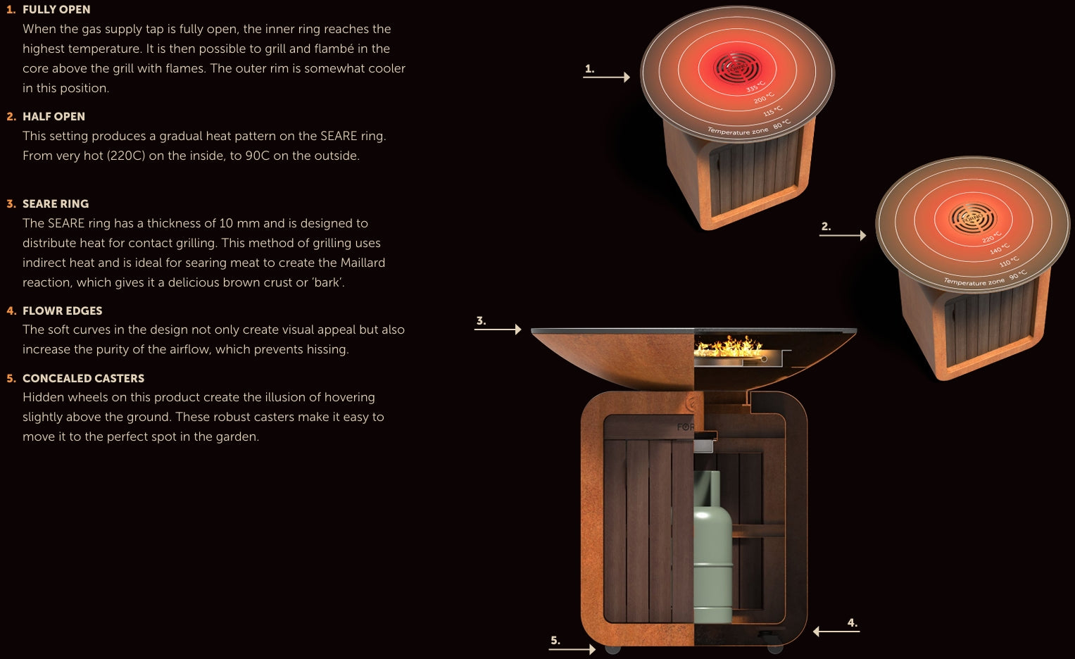 The SEARE HALO GAS is the ultimate outdoor kitchen, featuring a warm and inviting design. The gas-fired SEARE ring is specifically engineered to evenly distribute heat across the entire cooking surface, ensuring the perfect temperature for your favourite dishes. Plus, the gas cylinder is tucked away behind a sleek bamboo door, adding a touch of sustainability to the beautiful corten steel frame.