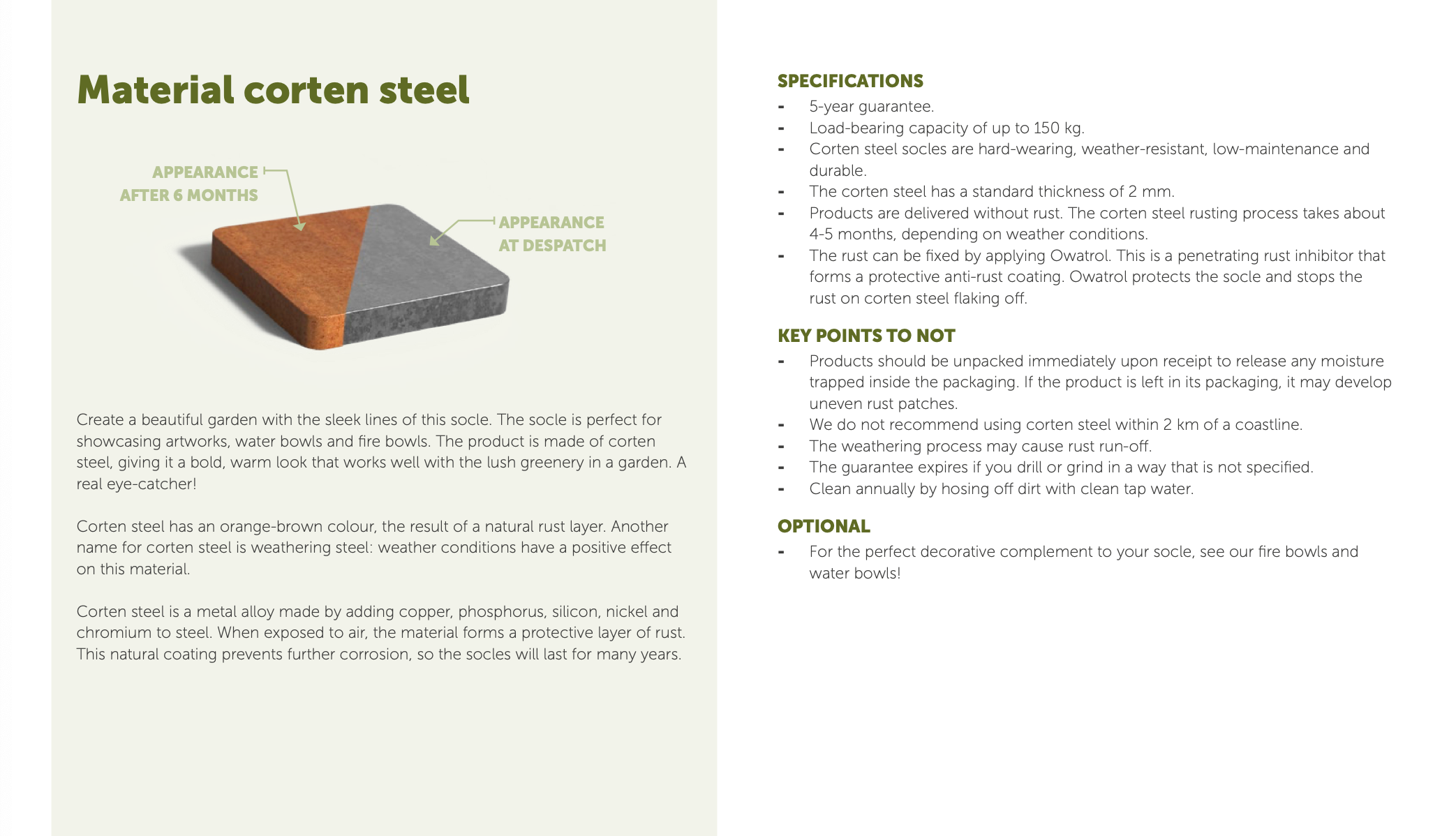 - Corten steel pedestals are hard-wearing, weather-resistant, low-maintenance and durable.